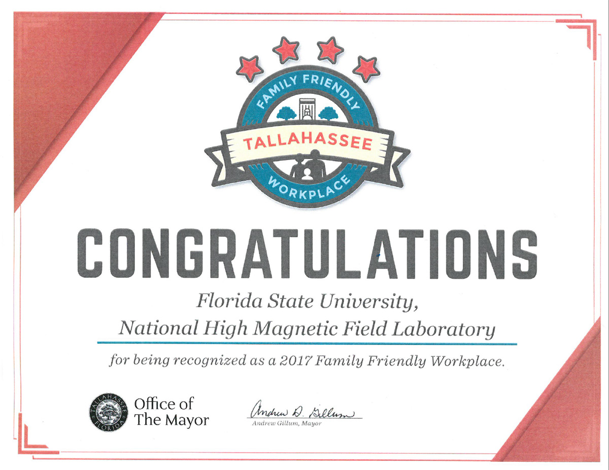 Recognized as a family-friendly workplace, the MagLab headquarters facility encourages a sense of community, including