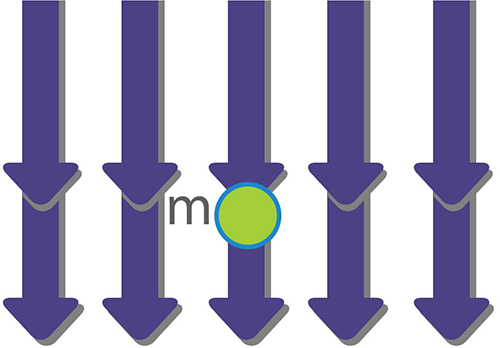 The concept of the electric field is a bit esoteric compared to, let’s say, a gravitational field because we can interact much more easily with a gravitational field than we can with an electric field. If we take a ball (basketball, golf ball, baseball, etc.) and drop it, we see that it falls toward the Earth. This happens because the ball is in a gravitational field and the gravitational field produced by the Earth interacts with the mass of the ball. We assume, for the most part, that the gravitational field experienced by the ball is uniform, therefore, the ball falls straight from your hand to the ground. The force exerted by the field on the ball is F = mg (force =mass of the ball x gravity) Figure 1.