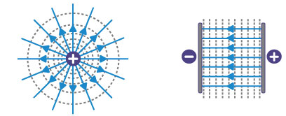 An electric field is a bit different because in order to interact with the field you need to use what is commonly referred to by physicists as a test charge. In an electric field, a test charge is analogous to the ball in the gravitational field. If a test charge is placed in an electric field, it will move just like the ball moves in a gravitational field because the electric field interacts with the charge of the test charge in much the same way that gravity interacted with the mass of the ball in the previous example. An electric field is produced around any source of electric charge. Just as a ball can have different amounts of mass depending on the type of ball (baseball, basketball, etc…), a test charge can have different amounts of charge depending on the source. The unit used to measure the amount of charge in a test charge is the coulomb (C), akin to the unit of mass used for the ball, which is kilograms (kg). Another difference between electric and gravitational fields is that an object with mass always experiences a force in the direction of the gravitational field (i.e., down toward the floor for any object near the Earth’s surface). On the other hand, for an object with charge in an electric field, the direction of the force depends on whether the charge is negative or positive. Since we know opposites attract, a positive test charge will move toward the negative side of the electric field. Also, the shape of the field depends on the shape of the object producing the field. If you look at Figure 2 below, you will notice that a point charge produces a field that emanates radially from the point, whereas the two parallel plates that have charges placed on them produce a uniform field between them. As you may have noticed, the two parallel plates more closely resemble the uniform gravitational field from Figure 1, with the main difference being that the electric field can exist in any direction — unlike the gravitational field, which only moves down toward the Earth.