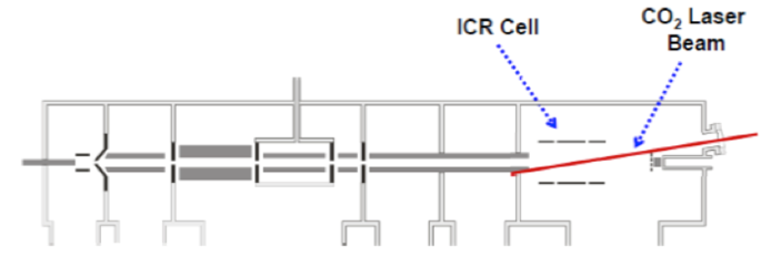 Infrared multiphoton dissociation (IRMPD) is often used in conjunction with Fourier transform ion cyclotron resonance mass spectrometry (FT-ICR MS) to fragment gas-phase ions inside the ICR cell. A CO2 laser is aligned to send a beam of infrared photons through a window at the end of the vacuum chamber to the center of the ICR cell. The ions trapped at the center of the cell can absorb multiple photons if their vibration is resonant with the laser frequency. The ion’s absorption of photons results in the excitement of the ion to higher energy states, and ultimately dissociation if enough energy (in photons) is absorbed to break a bond within the ion. The amount of energy infused into the system is a function of laser power and irradiation time and is tunable.