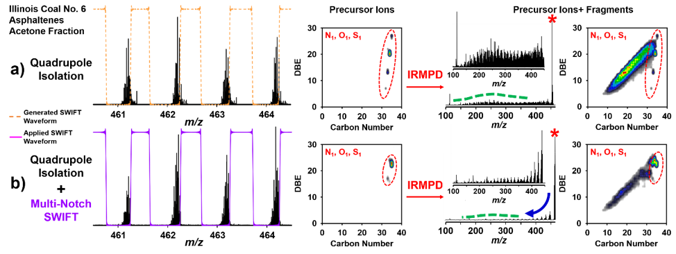 Advanced understanding of the structure of complex mixtures is achieved by applying a multinotch SWIFT waveform (highlighted in purple, panel b) to the quadrupole isolated ions, once they are trapped inside the ICR cell. In this case, the application of the SWIFT waveform enables the isolation of ions with low mass defect/high DBE (˂0.250000, DBE˃16) through ejection of ions with higher mass defects outside of that window (high SWIFT amplitude). Therefore, only ions within a 4-Da isolation window with a mass defect lower than 0.25000 Da remained in the ICR cell prior to IRMPD. The compositional range for the SWIFT-isolated precursor ions demonstrates the efficacy of the method as only high-DBE precursors are present prior to IRMPD. The fragmentation mass spectrum reveals both dealkylation (blue arrow) and the low MWD with lower relative abundance, which suggests that high DBE precursors can yield low DBE fragments. This knowledge is central to predict the processability of feedstocks to produce high value fuels and the fate of emerging contaminants in the environment.