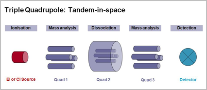 Since Tandem MS involves three distinct steps of selection-fragmentation-detection, the separation of these three steps can be realized in space or in time.