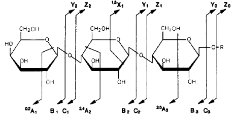 For oligosaccharides, fragments containing the reducing end (reducing end is on the right-hand side in the figure) are labeled x, y, or z, depending on the site of the cleavage, whereas fragments containing the other end are labeled a, b, or c. The numbers indicate the site of the sugar residue: y, z, b, and c ions are fragments due to glycosidic cleavages (cutting glycosidic bonds holding two adjacent sugar residues), whereas a and x ions result from cross-ring cleavage.