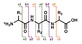 Fragments containing the N-terminus are labeled a, b, or c, depending on the site of the cleavage, whereas fragments containing the C-terminus are labeled x, y, or z. The numbers indicate the number of amino acid residues in the fragment ion.