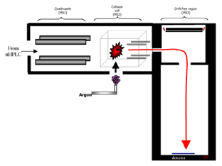 In the QTOF, precursor ions are selected in the Quadrupole and sent to the Collision Cell for fragmentation. The generated product ions are detected by time-of-flight (TOF) mass spectrometry.